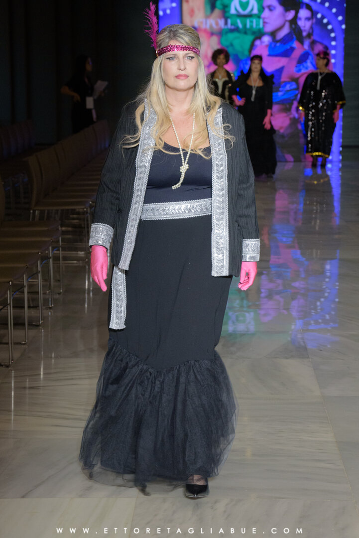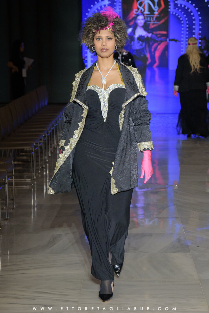 Scopri l'eleganza senza tempo dell'abito a sirena nero, impreziosito da affascinanti decorazioni dorate. Completa il look con una giacca retrò che brilla di dettagli dorati, un vero e proprio omaggio al passato reinterpretato in chiave moderna. Disponibile nelle taglie 48 - 50.